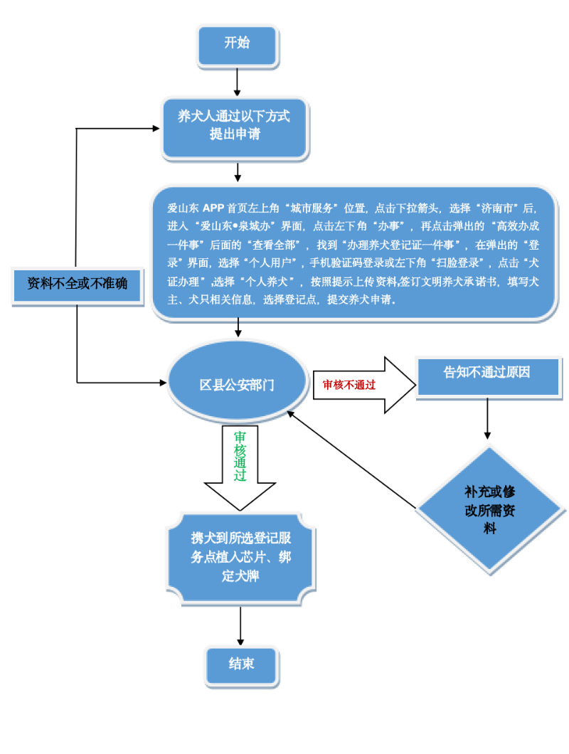 1.网上受理。养犬人在在“爱山东”APP左上角“城市服务”位置,点击下拉箭头,选择“济南市”,进入“爱山东·泉城办”界面,在“济南市”右侧搜索栏输入“养犬”,点击“济南市公安局养犬治安管理信息系统”--“犬证办理”按照提示在线申请;各分县局治安大队进行网上审核。 2.线下办理。全市目前有89家登记服务点(动物诊疗机构)可以为犬只注射电子芯片、绑定犬牌。