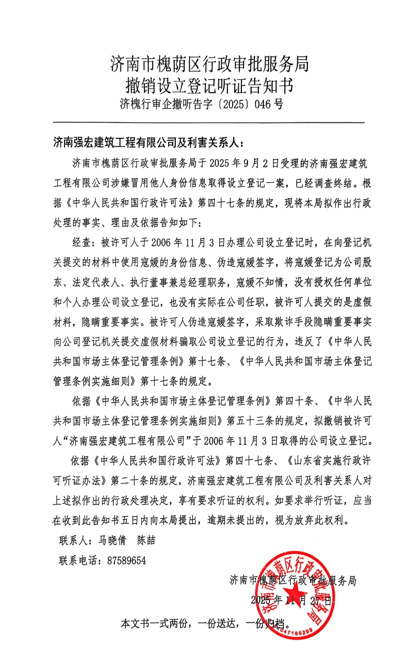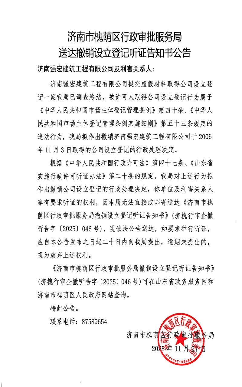 撤销设立登记听证告知书及公告送达【2025】第046号(济南强宏建筑工程有限公司)