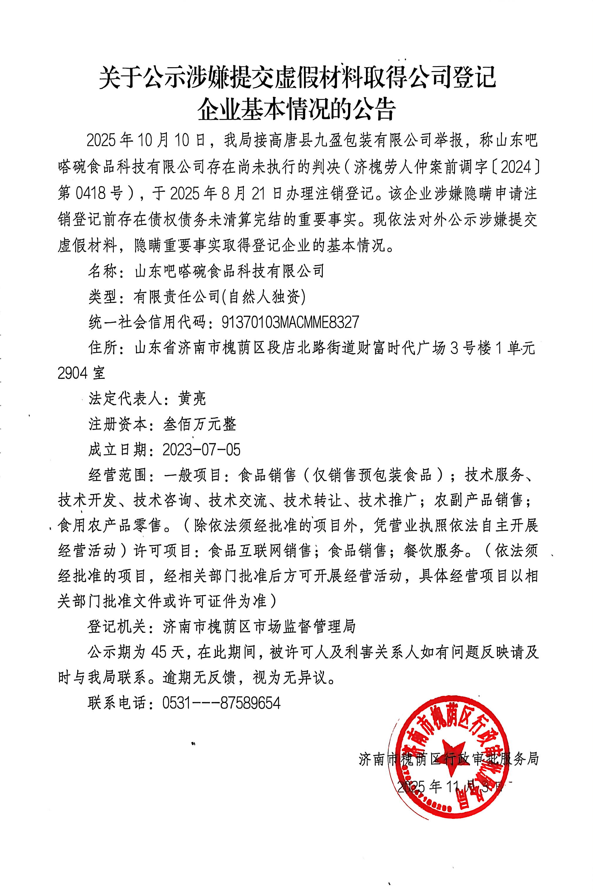 关于公示涉嫌提交虚假信息取得公司登记基本情况的公告(山东吧嗒碗食品科技有限公司)