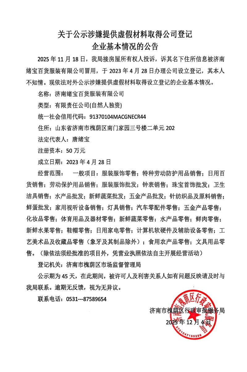关于公示涉嫌提交虚假信息取得公司登记基本情况的公告(济南绪宝百货服装有限公司)