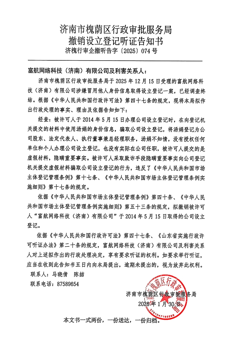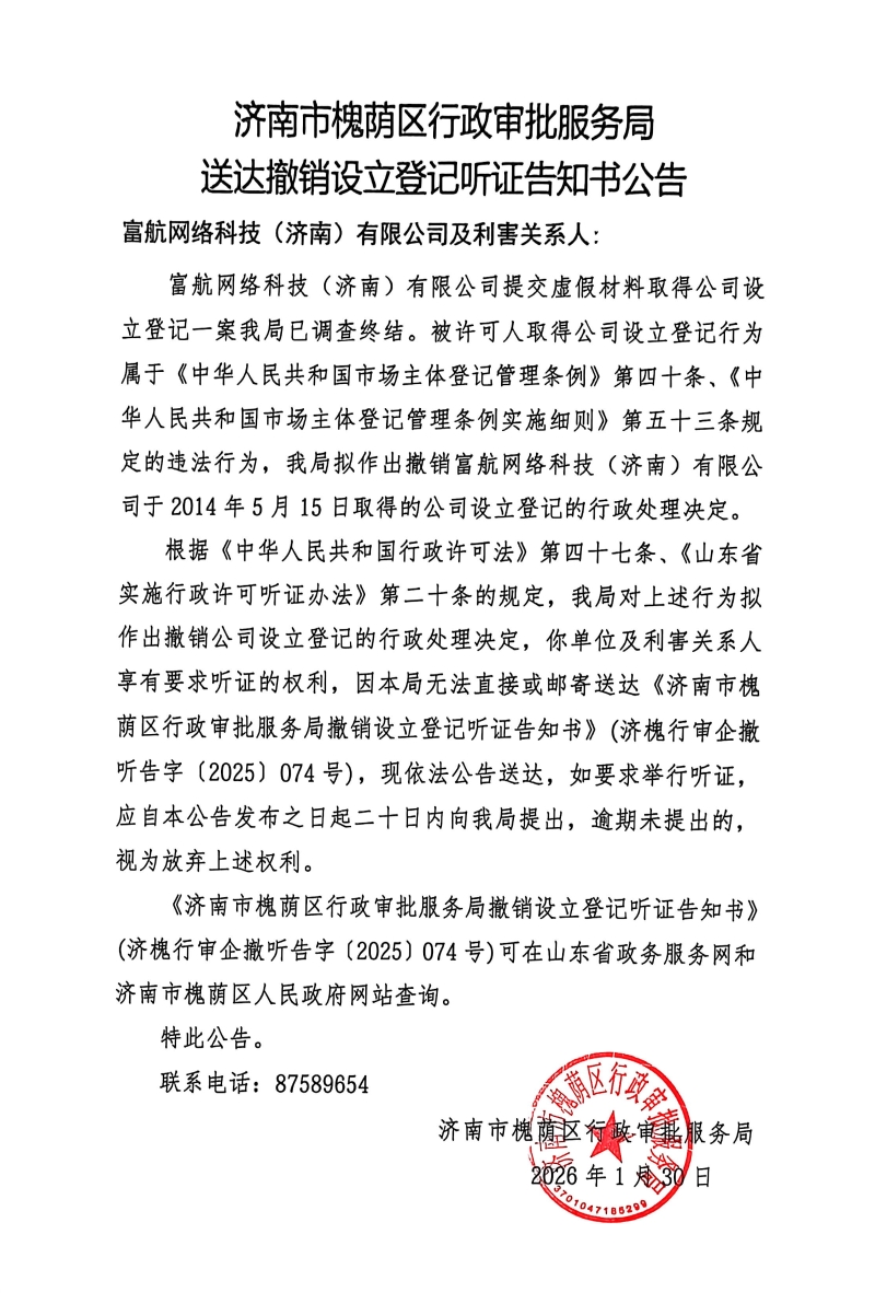 撤销设立登记听证告知书及公告送达【2025】第074号(富航网络科技(济南)有限公司)