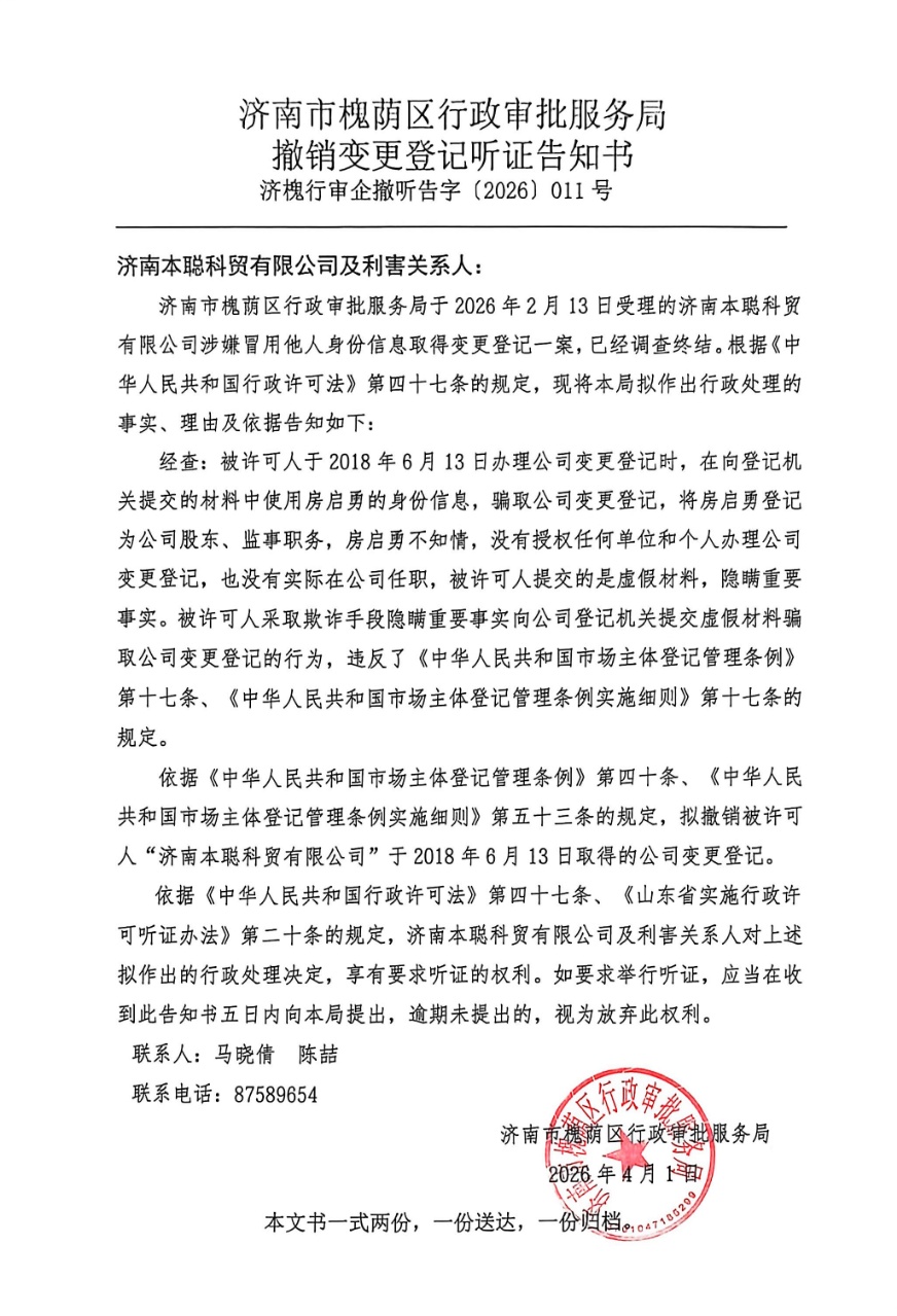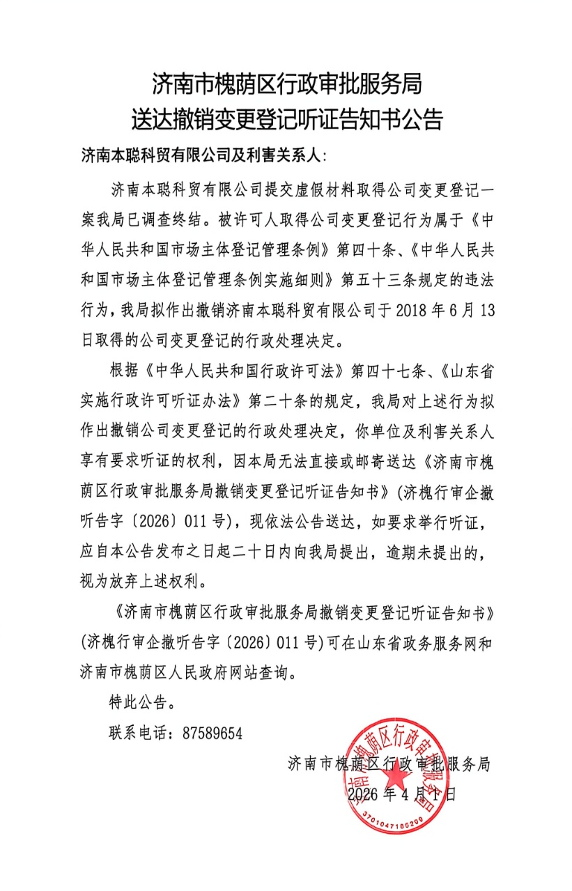 撤销变更登记听证告知书及公告送达【2026】第011号(济南本聪科贸有限公司)