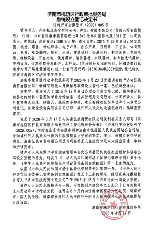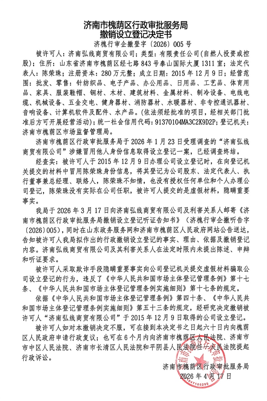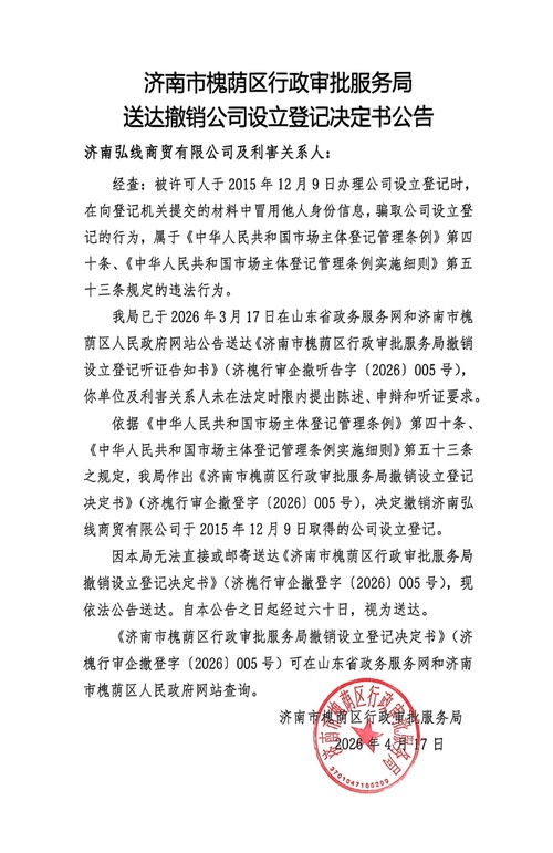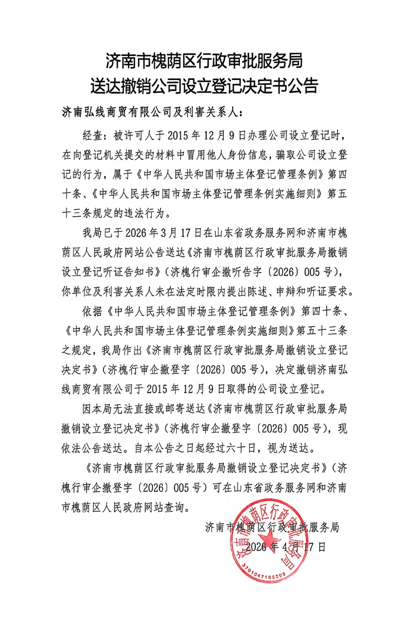 撤销设立登记决定书及公告送达【2026】第005号(济南弘线商贸有限公司)