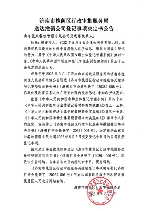 撤销变更登记决定书及公告送达【2026】第006号(山东望兴餐饮管理有限公司)