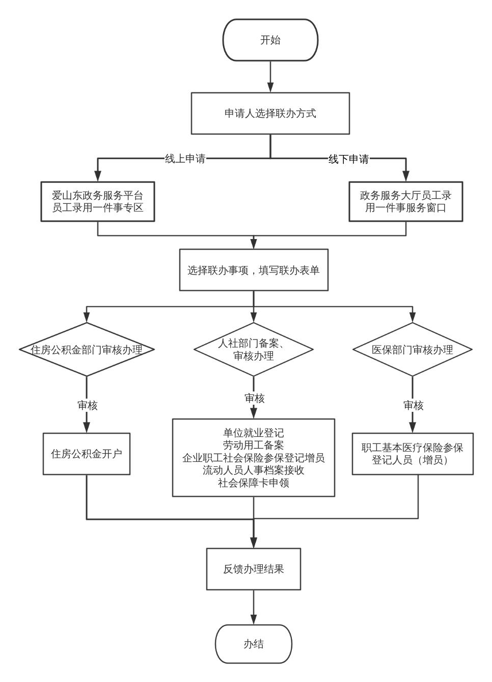 | 办理形式 | 1.现场申请。各地政务服务中心(社保经办大厅)相关窗口提出申请。 2.线上申请。“爱山东”政务服务平台“高效办成‘一件事’”专区“员工录用‘一件事’”模块申请。 | 结果领取方式 | 1.窗口出件。当地员工录用“一件事”服务窗口。 2.在线查询。“爱山东”政务服务平台“高效办成一件事”专区。 3.邮寄送达。制发的社会保障卡依申请邮寄送达。 |