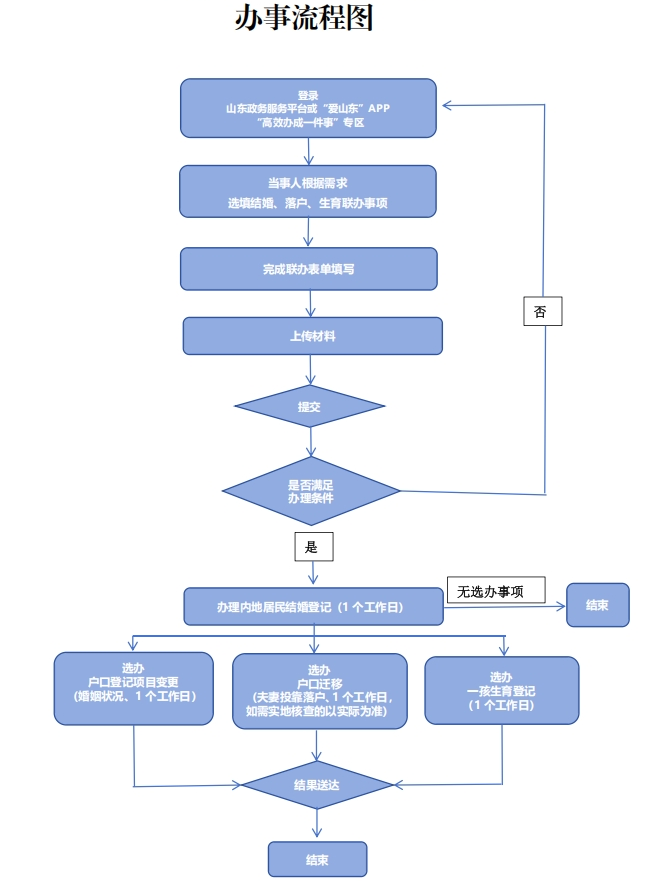 | 服务对象 | (一)具有山东省户籍,预约在山东省内办理内地居民结婚登记的当事人; (二)非山东省户籍,持有山东省居住证,预约在山东省内办理内地居民结婚登记的当事人(仅限申请居住地内地居民结婚登记预约和居住地生育登记申请); (三)军人、监狱服刑人员、港澳台居民、华侨和外国人按原规定办理。 | 法定办结时限 | 民政部门负责办理内地居民结婚登记,一般1个工作日内办结;卫生健康部门负责生育登记的审批,收到联办事项后1个工作日内办结;公安部门负责户口登记项目变更(婚姻状况)和户口迁移(夫妻投靠落户)审核,一般在收到联办事项后1个工作日内办结,户口迁移(夫妻投靠落户)需要进行实地核查的,以实际办理时间为准。 |