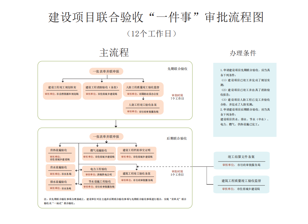 | 承诺办理时限 | 不超过12个工作日,其中先期联合验收7个工作日内,后期联合验收5个工作日内。 | 网上收费 | |