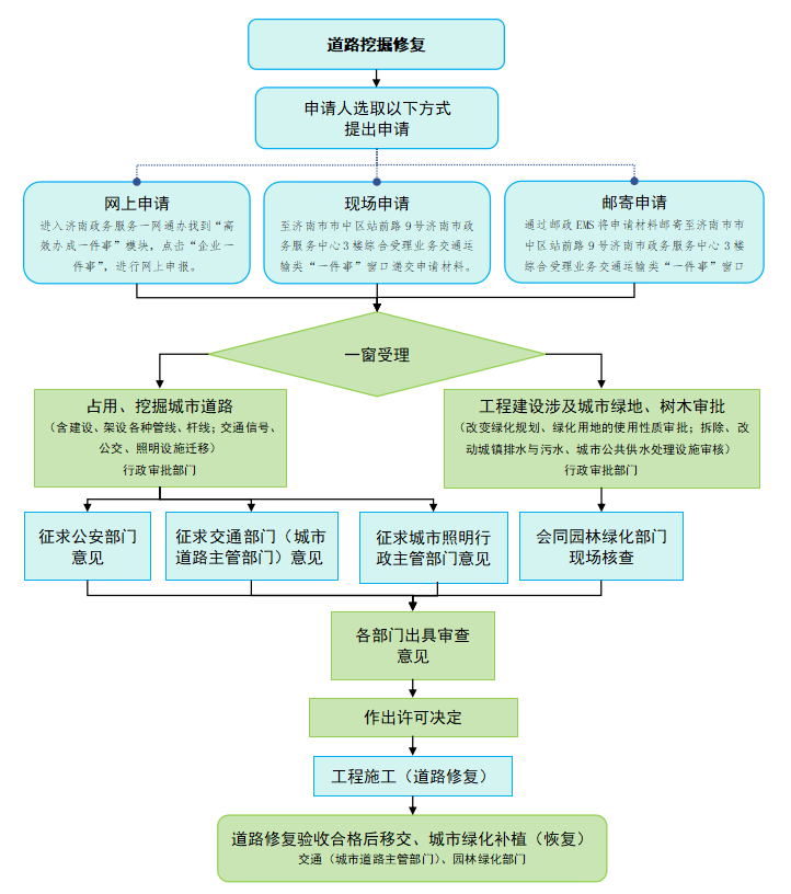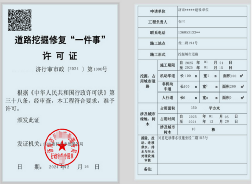 | 办理形式 | 1.线上办理。济南政务服务一网通办—主题集成服务—高效办成一件事—企业“一件事”—投资建设—选择道路挖掘修复“一件事”。 2.窗口办理。申请人到各级政务服务中心业务窗口递交申请材料。 | 结果领取方式 | 准予许可后,申请人登录“济南政务服务一网通办”网站,进入该企业用户中心,点击“我的证明证照”按键自行下载电子证照《道路挖掘修复“一件事”许可证》。 |