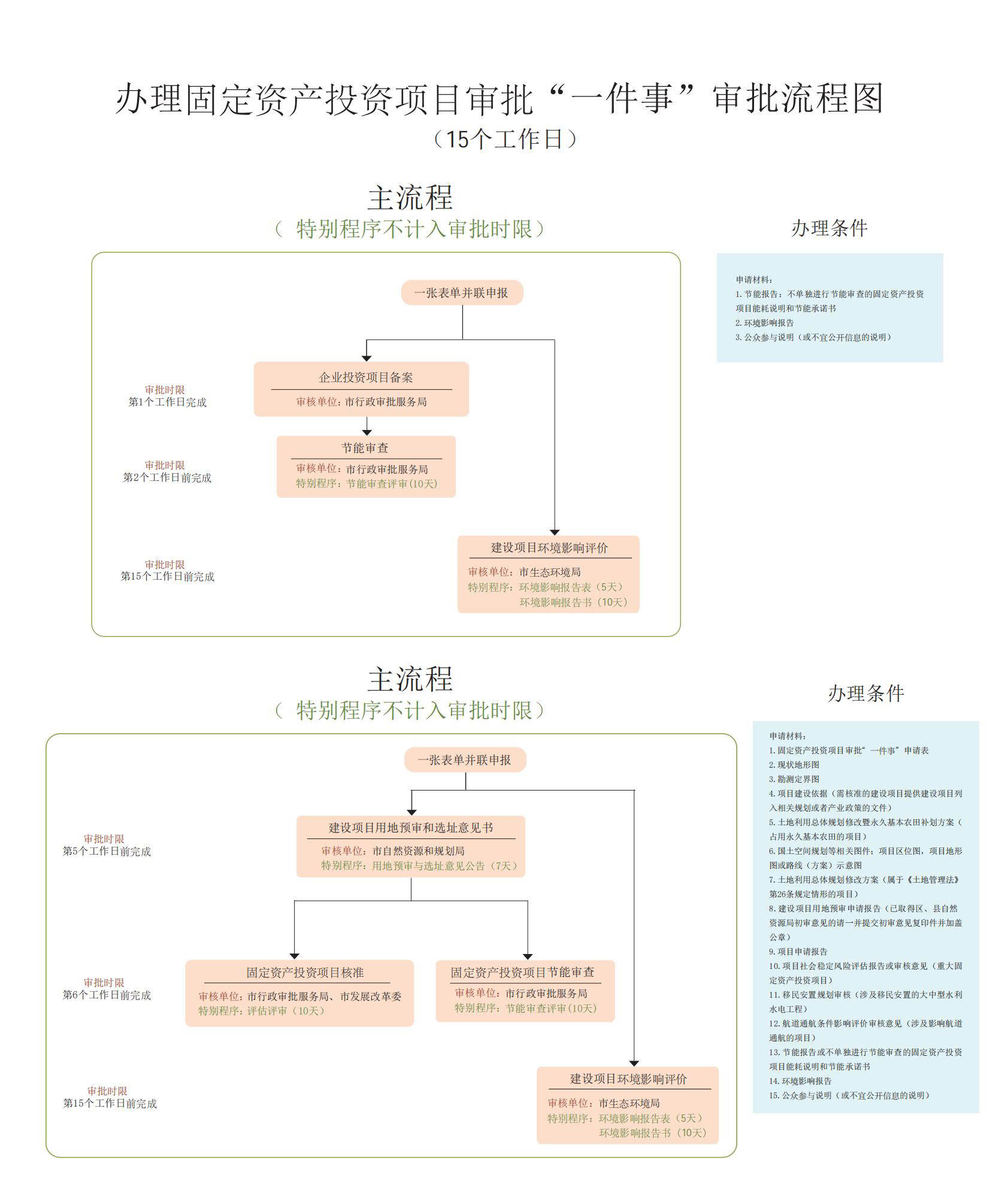 | “一件事”名称 | 固定资产投资项目审批“一件事” | 承诺时限 | 建设项目用地预审及选址意见书第5个工作日前完成;固定资产投资项目核准;固定资产投资项目节能审查第6个工作日前完成;建设项目环境影响报告书(表)第15个工作日前完成。 企业投资项目备案第1个工作日完成;固定资产投资项目节能审查第2个工作日前完成;建设项目环境影响报告书(表)第15个工作日前完成。 (申请人补正申请材料、整改、组织听证、专家评审、项目公示所需时间不计入办理时间) |