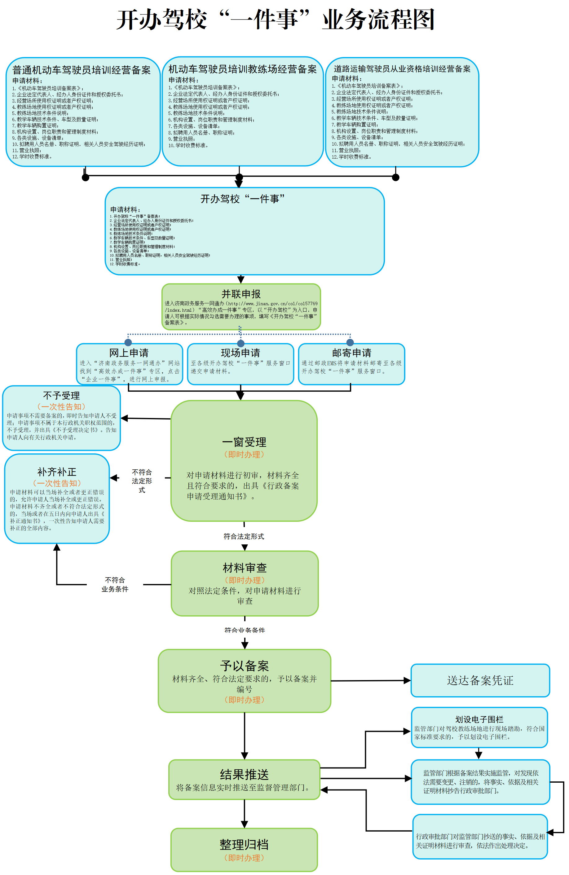 (一)线上。申请人注册并登录“济南政务服务一网通办”网站“高效办成一件事”专区,选择“开办驾校‘一件事’”。 (二)线下。申请人至企业注册地所在的市或区县(功能区)政务服务中心开办驾校“一件事”服务窗口办理(详见办理地点)。