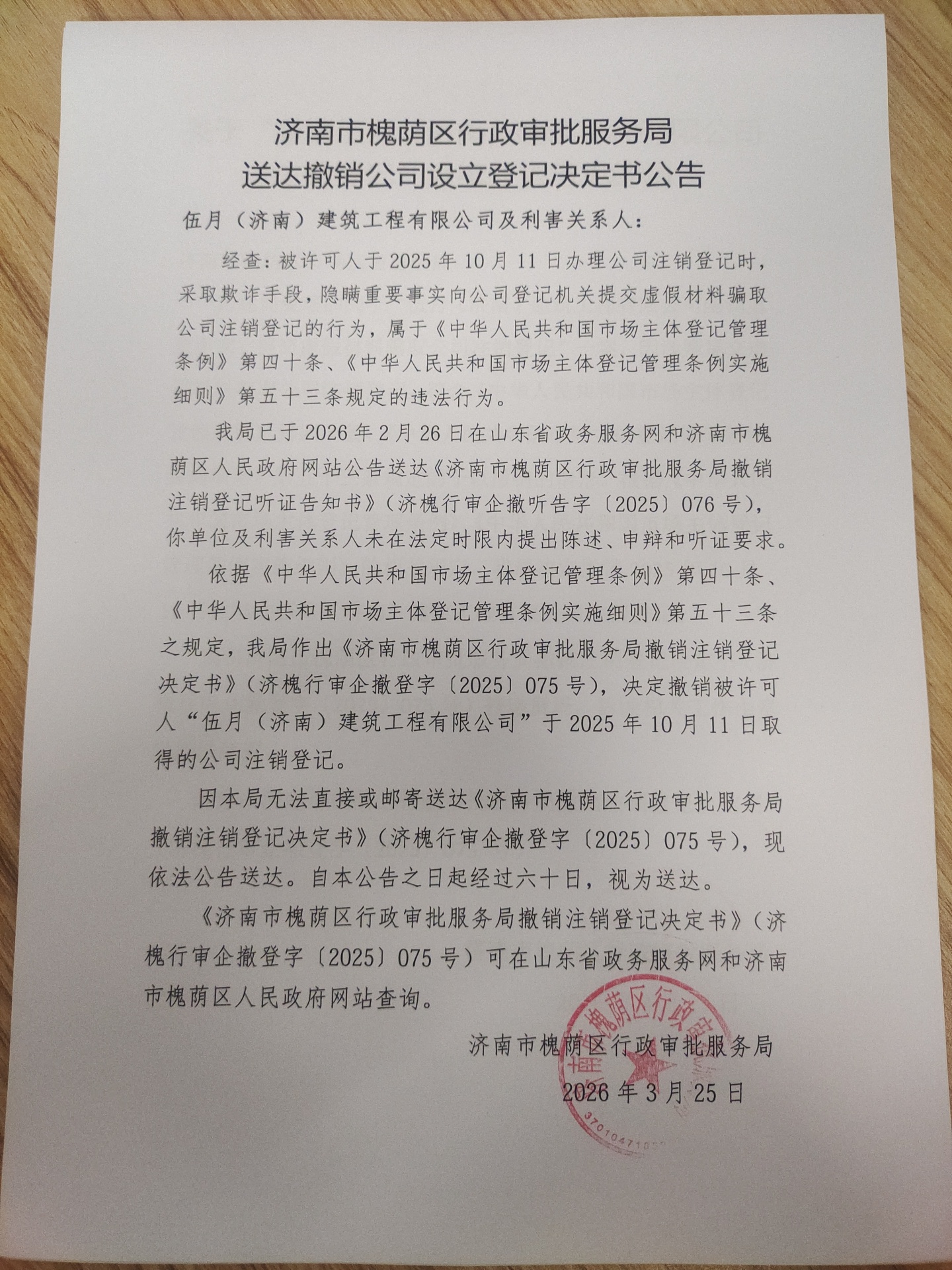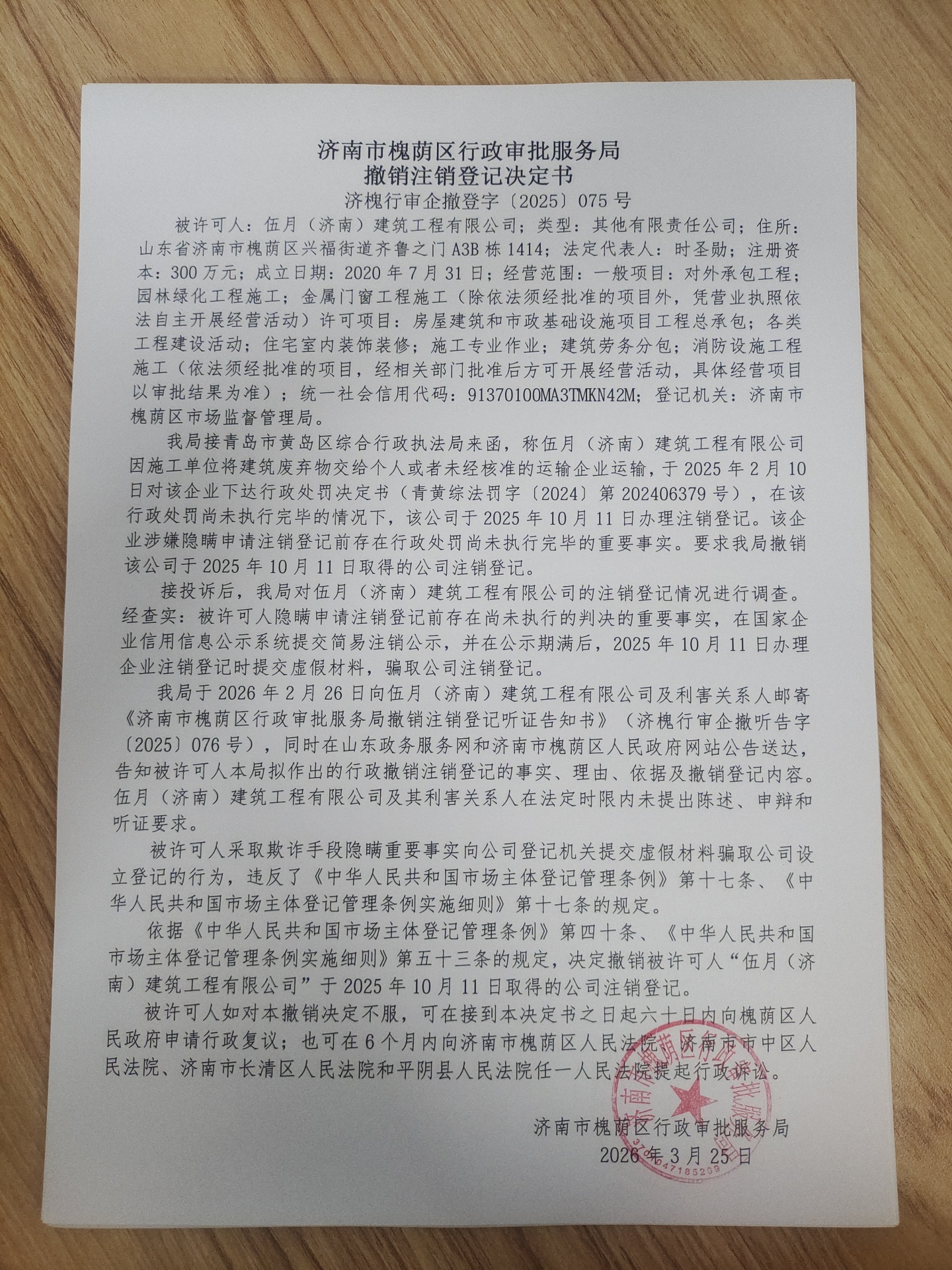 撤销注销登记决定书及公告送达【2025】第075号(伍月(济南)建筑工程有限公司)