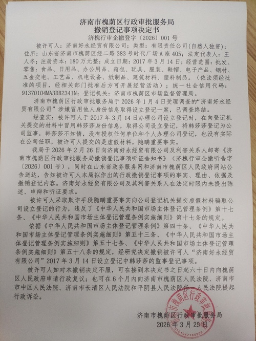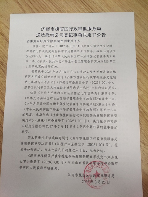 撤销登记事项决定书及公告送达【2026】第001号(济南好永经贸有限公司)
